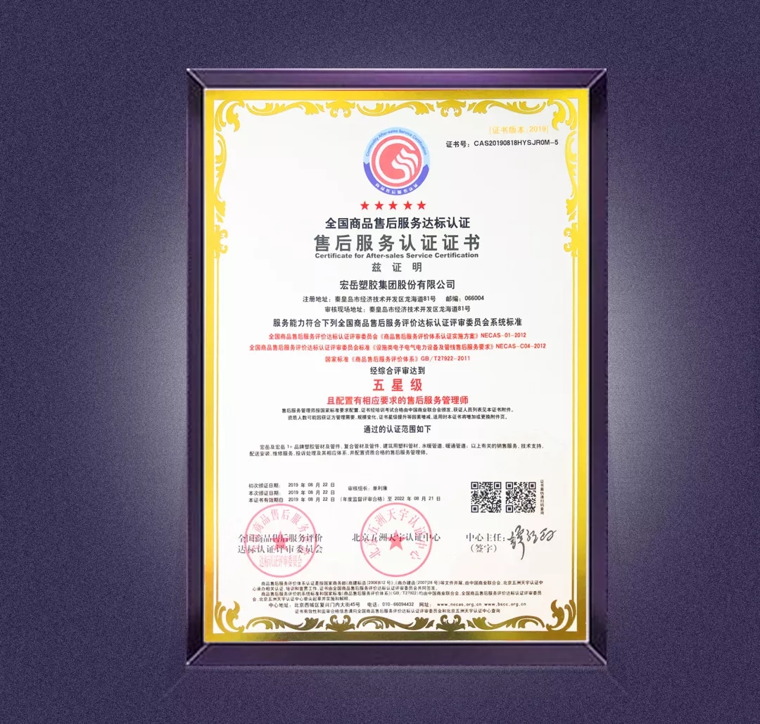 8月22日,九游会·塑胶集团股份有限公司通过全国商品售后服务达标认证,获得五星级售后服务认证证书。